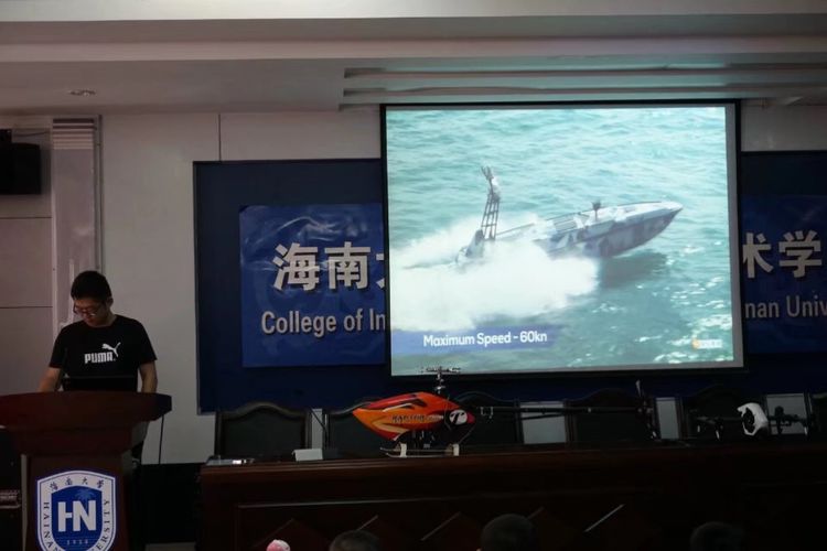 接着我们到了楼下,看到了大无人船,任泓瑞爸爸耐心的为我们讲解着