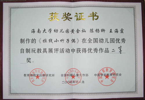 2007年11月21日,教育部教育仪器研究所、全国妇联儿童工作部和中国学前教育研究会在北京联合举办的全国幼儿园优秀自制玩教具展评活动。我园黄金灿、陈杨柳、王海霞三位老师制作的《拉线小竹子偶》和辛雪、吕馨蕾两位老师制作的《翻翻乐》等两件作品,代表海南省参加展评活动,被分别评为二、三等奖。